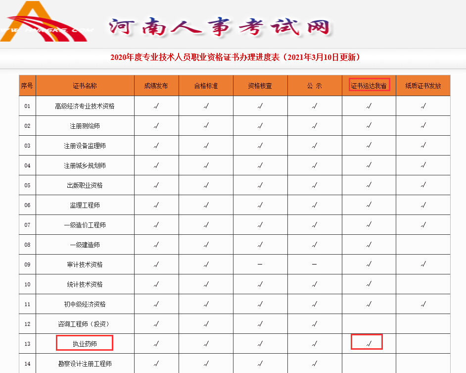 根據(jù)河南人事考試網(wǎng)“2020年度專業(yè)技術(shù)人員職業(yè)資格證書辦理進(jìn)度表(2021年3月10日更新)”得知,河南省2020年執(zhí)業(yè)藥師考試合格證書已運達(dá)至河南省,相信近期就會發(fā)放紙質(zhì)證書,請考生們耐心等待。
