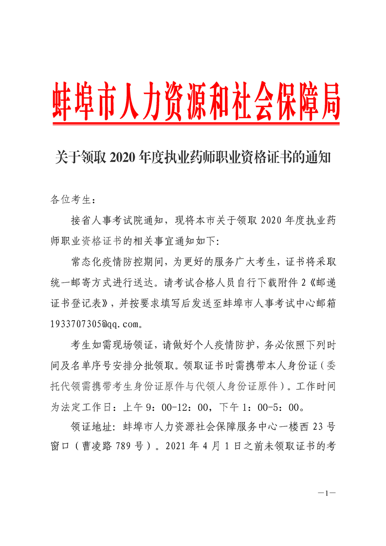 安徽蚌埠關(guān)于領(lǐng)取2020年度執(zhí)業(yè)藥師資格證書的通知