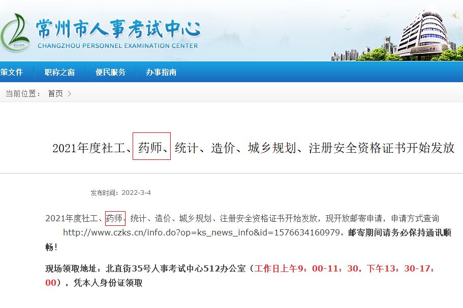 江蘇常州2021年度執(zhí)業(yè)藥師資格證書開始發(fā)放