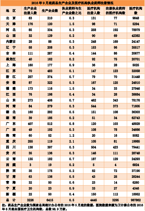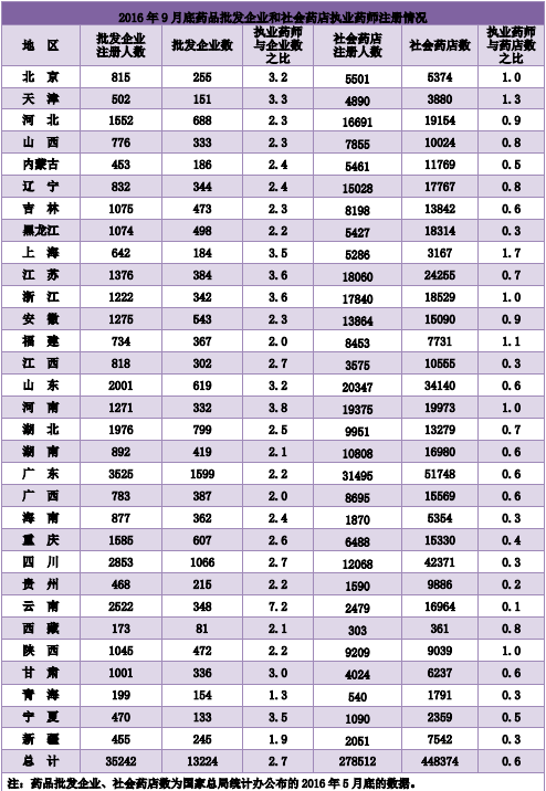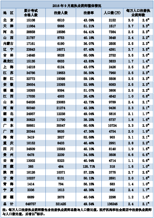 2016年9月全國執(zhí)業(yè)藥師注冊情況