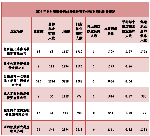 藥品生產(chǎn)企業(yè)、醫(yī)療機(jī)構(gòu)中執(zhí)業(yè)藥師積極注冊于本職單位,藥品批發(fā)企業(yè)和社會藥店中執(zhí)業(yè)藥師注冊顯著增加。部分藥品連鎖經(jīng)營企業(yè)執(zhí)業(yè)藥師配備情況見下圖。