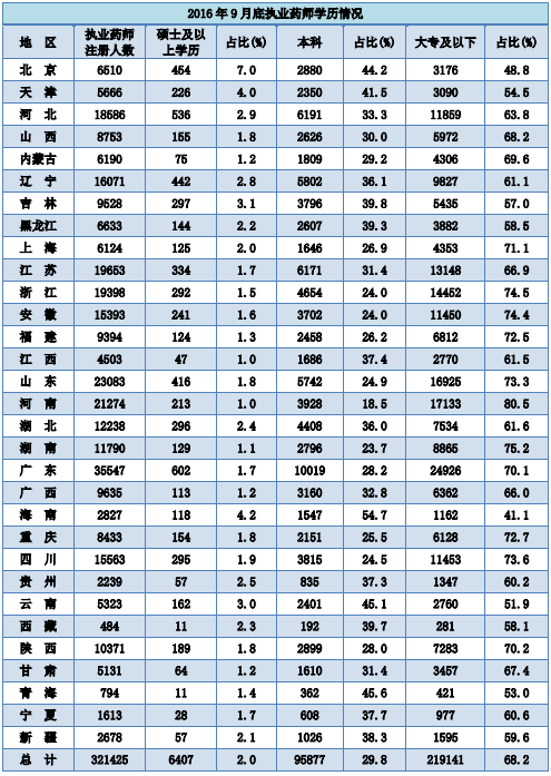 截至2016年9月30日,執(zhí)業(yè)藥師學(xué)歷分布情況:研究生6407人,本科95877人,大專114278人,中專104863人;本科及以上學(xué)歷占比31.8%。