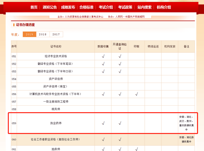 中國人事考試網(wǎng)終于更新了關(guān)于執(zhí)業(yè)藥師證的辦理進(jìn)度,大部分地區(qū)的審核數(shù)據(jù)已經(jīng)收集完畢,且已經(jīng)開通查詢驗(yàn)證功能。目前還有安徽、湖北、武漢、貴州、重慶在數(shù)據(jù)收集中,所以這幾個(gè)地區(qū)還查不到!