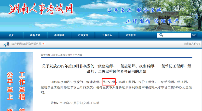 另外,湖南可以領(lǐng)取補(bǔ)換發(fā)的執(zhí)業(yè)藥師資格證啦!湖南人事考試網(wǎng)發(fā)布“2019年10月補(bǔ)換發(fā)湖南執(zhí)業(yè)藥師資格證的通知”,如下: