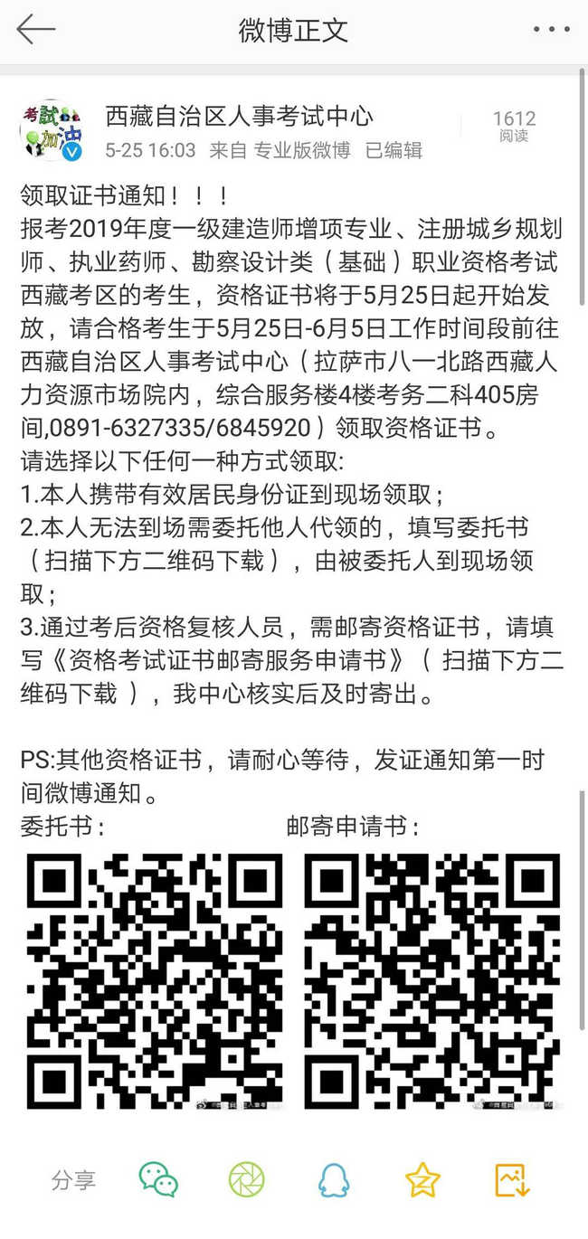西藏自治區(qū)人事考試中心微博發(fā)布2019年證書領(lǐng)取的通知,具體內(nèi)容如下: