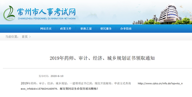 常州市人事考試網(wǎng)發(fā)布了2019年藥師、審計(jì)、經(jīng)濟(jì)、城鄉(xiāng)規(guī)劃證書領(lǐng)取通知,具體內(nèi)容如下: