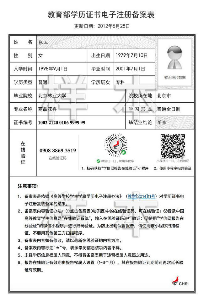 附:《教育部學(xué)歷證書電子注冊(cè)備案表》(樣表)