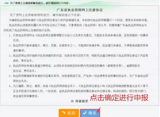 彈出執(zhí)業(yè)藥師網(wǎng)上注冊(cè)協(xié)議后閱讀協(xié)議內(nèi)容,點(diǎn)擊確定進(jìn)行申報(bào)。