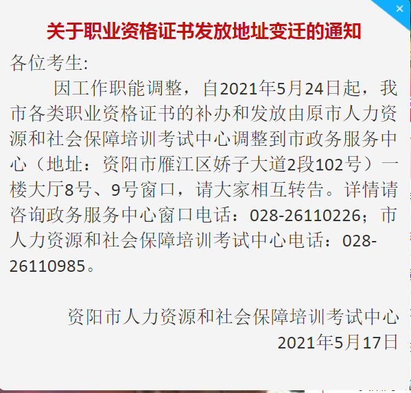 因工作職能調(diào)整,自2021年5月24日起,我市各類職業(yè)資格證書的補(bǔ)辦和發(fā)放由原市人力資源和社會(huì)保障培訓(xùn)考試中心調(diào)整到市政務(wù)服務(wù)中心(地址:資陽市雁江區(qū)嬌子大道2段102號(hào))一樓大廳8號(hào)、9號(hào)窗口,請(qǐng)大家相互轉(zhuǎn)告。詳情請(qǐng)咨詢政務(wù)服務(wù)中心窗口電話:028-26110226;市人力資源和社會(huì)保障培訓(xùn)考試中心電話:028-26110985。