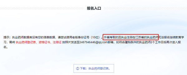 第二種:在外省通過(guò)考試,但是執(zhí)業(yè)注冊(cè)在江蘇省的執(zhí)業(yè)藥師,需先提交【執(zhí)業(yè)藥師登記表、資格證書(shū)、注冊(cè)證】拍照片發(fā)送至2487946446@qq.com郵箱,待審核通過(guò)其符合建檔條件后,再進(jìn)入通道報(bào)名,進(jìn)行繼續(xù)教育。
