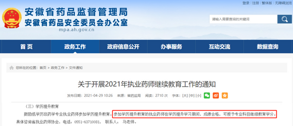 根據(jù)安徽省發(fā)布的2021年執(zhí)業(yè)藥師繼續(xù)教育工作通知,其中提到,鼓勵(lì)低學(xué)歷非藥學(xué)專業(yè)執(zhí)業(yè)藥師參加學(xué)歷提升教育。參加學(xué)歷提升教育的執(zhí)業(yè)藥師在學(xué)歷提升學(xué)習(xí)期間,成績(jī)合格,可授予專業(yè)科目繼續(xù)教育學(xué)分。