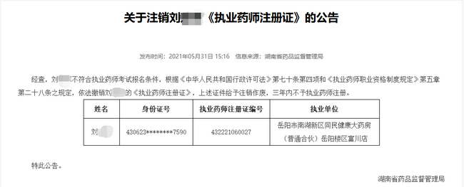 5月31日,湖南省藥監(jiān)局通報,經(jīng)查,劉某某不符合執(zhí)業(yè)藥師考試報名條件,根據(jù)有關(guān)規(guī)定,依法撤銷劉某某的《執(zhí)業(yè)藥師注冊證》,上述證件給予注銷作廢,三年內(nèi)不予執(zhí)業(yè)藥師注冊。