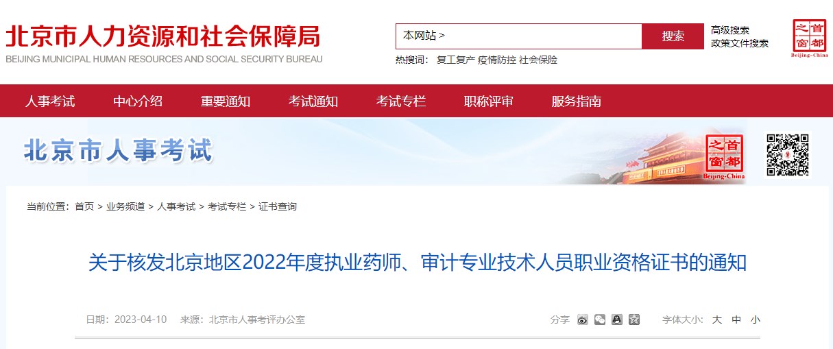 關(guān)于核發(fā)北京地區(qū)2022年度執(zhí)業(yè)藥師、審計(jì)專(zhuān)業(yè)技術(shù)人員職業(yè)資格證書(shū)的通知