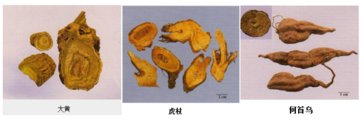 虎杖 | 虎杖 | 根及根莖 | 切面皮部較薄,木部寬廣,棕黃色,射線放射狀,皮部與木部較易分離;根莖髓中有隔或呈空洞狀 | |