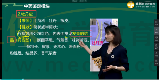 牡丹皮:外表面灰褐色或黃褐色,有多數(shù)橫長皮孔樣突起及細(xì)根痕,栓皮脫落處粉紅色:內(nèi)表面淡灰黃色或淺棕色,有明顯的細(xì)縱紋,常見發(fā)亮的結(jié)晶。質(zhì)硬而脆,易折斷,斷面較平坦,淡粉紅色,粉性。氣芳香,味微苦而澀。