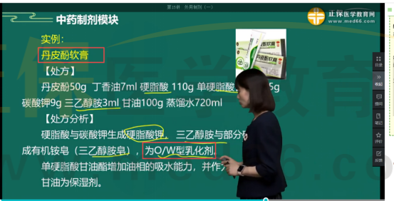 丹皮酚軟膏【注解】硬脂酸與碳酸鉀生成硬脂酸鉀,三乙醇胺與部分硬脂酸形成有機(jī)銨皂(三乙醇胺皂),為O/W型乳化劑,單硬脂酸甘油酯增加油相的吸水能力,并作為穩(wěn)定劑。甘油為保濕劑。