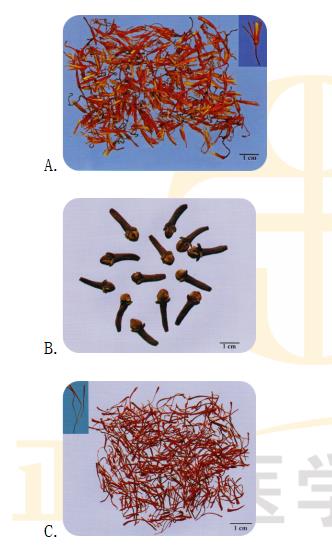 ①丁香:暗紅棕色;花粉粒極面觀三角形,赤道表面觀雙凸鏡形,具3副合溝;含草酸鈣簇晶、油室。