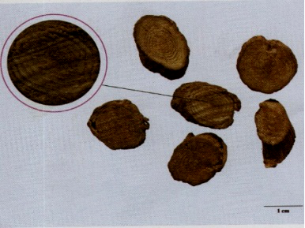 區(qū)別點(diǎn):環(huán)為斷續(xù)排列,且環(huán)數(shù)為2~4輪為牛膝,有數(shù)輪同心環(huán)(連續(xù)成環(huán))是川牛膝。