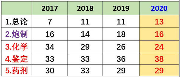 從上表可以看出,中藥一的重點(diǎn)章節(jié)一直都是化學(xué)、鑒定和藥劑三章,這三章平均每年分值都在30分左右。2020年鑒定考察分值最多,高達(dá)38分,鑒定、化學(xué)、藥劑這三章合計(jì)考察了91分,我們中藥一是72合格,可見掌握好這三章,考試直達(dá)完全沒有問題。
