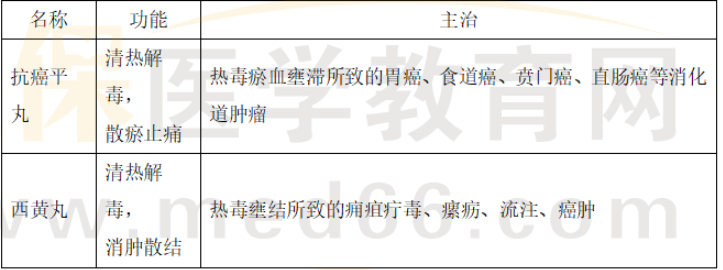 【解析】西黃丸:功能是清熱解毒,消腫散結(jié)。主治:熱毒壅結(jié)所致的癰疽疔毒、瘰疬、流注、癌腫。