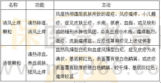 【解析】消銀顆?!竟δ堋壳鍩釠鲅?,養(yǎng)血潤(rùn)膚,祛風(fēng)止癢。【主治】血熱風(fēng)燥型白疕和血虛風(fēng)燥型白疕,癥見(jiàn)皮疹為點(diǎn)滴狀、基底鮮紅色、表面覆有銀白色鱗屑、或皮疹表面覆有較厚的銀白色鱗屑、較干燥、基底淡紅色、瘙癢較甚。