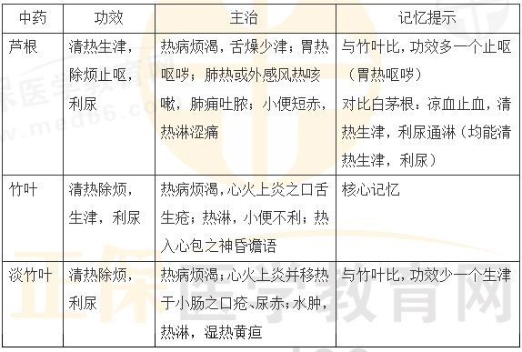【解析】白茅根的功效:涼血止血,清熱生津,利尿通淋。蘆根的功效:清熱生津,除煩止嘔,利尿。二者均能利尿、清熱生津。蘆根的利尿和利尿通淋一致。