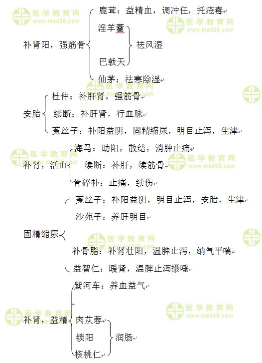 代表藥記憶小口訣:馬鹿羊狗菟蛤蟲(chóng),戟茅鎖陽(yáng)肉蓯蓉,益智杜斷骨碎補(bǔ),沙苑核車(chē)女胞宮?!踞t(yī)學(xué)教育網(wǎng)原創(chuàng)】