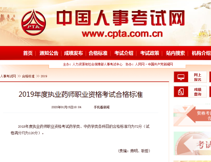 2020年1月15日,中國人事考試網(wǎng)公布2019年度執(zhí)業(yè)藥師職業(yè)資格考試藥學類、中藥學類各科目的合格標準均為72分(試卷滿分均為120分)。