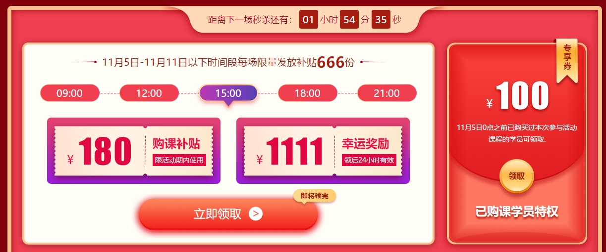 1.已購課學(xué)員范圍:11月5日0點(diǎn)之前購買過參與活動課程的學(xué)員可領(lǐng)??;