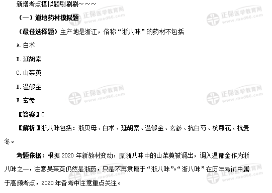 根據2020年執(zhí)業(yè)藥師《中藥學專業(yè)知識(一)》最新版教材,醫(yī)學教育網整理了新增考點模擬題+考點整理+考察概率!以下是相應內容的第一部分,有習題,有答案解析,考生請務必收藏好!以方便后續(xù)備考時使用!