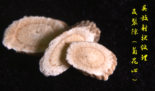 3.質(zhì)硬而韌,不易折斷。斷面纖維性強,并顯粉性,皮部黃白色,木部淡黃色,具放射狀紋理及裂隙(菊花心)