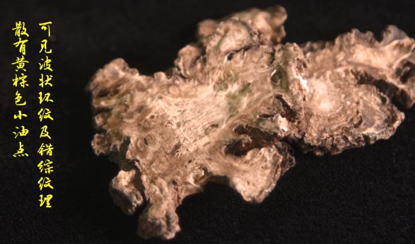 3.質(zhì)堅(jiān)實(shí),不易折斷,斷面黃白色或灰黃色,可見波狀環(huán)紋及錯(cuò)綜紋理,散有黃棕色小油點(diǎn)