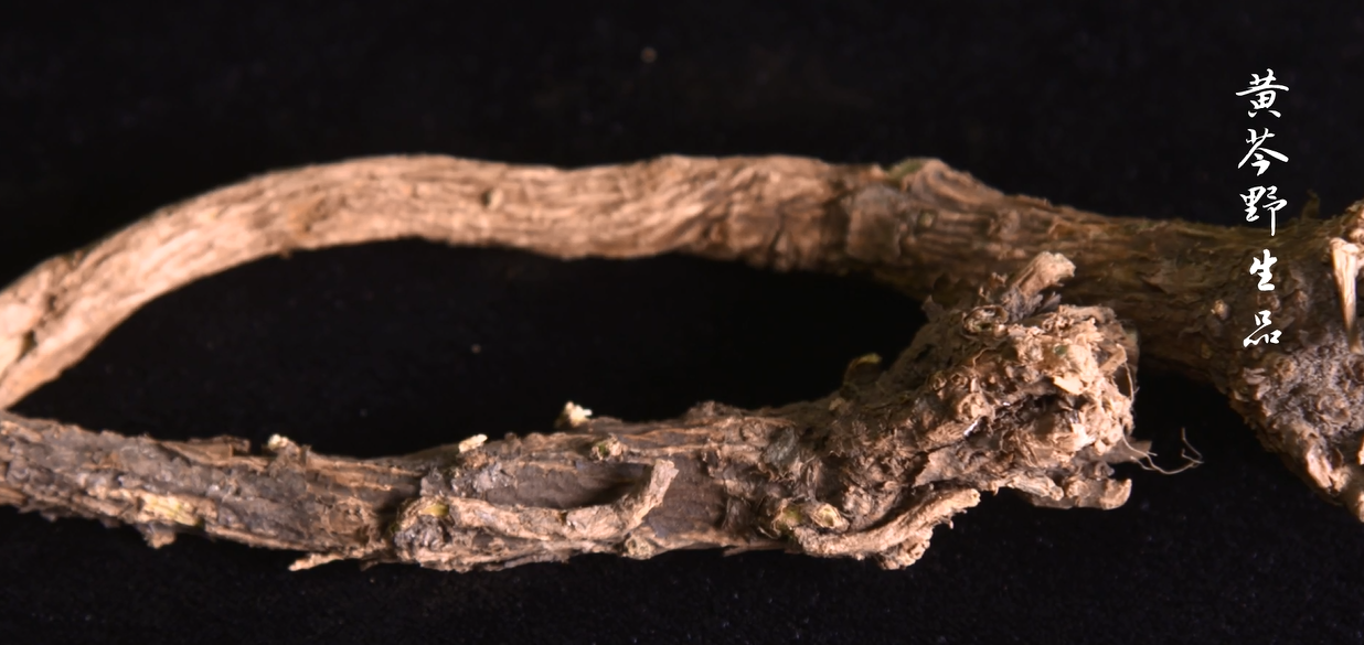1.黃芩野生品,呈圓錐形,扭曲,長8~25cm,直徑1~3cm