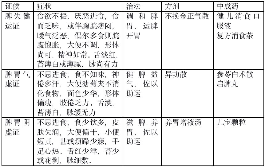 2.患兒,3歲。體重13kg,自入幼兒園2個(gè)月來(lái),食欲不振,面色少華,偶爾多食后則脘腹飽脹,惡心,形體尚可,精神如常,二便不調(diào),舌苔薄膩。其治法是