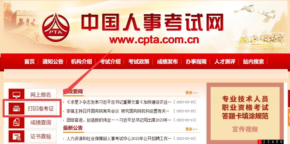 ①進入中國人事考試網(wǎng):,點擊左側導航欄“打印準考證”進入準考證打印頁面。