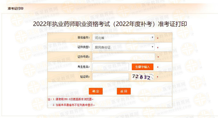 ⑤選擇報名省市、證件類型,填寫證件號碼、考生姓名、驗證碼,進行2022執(zhí)業(yè)藥師補考準考證打印。