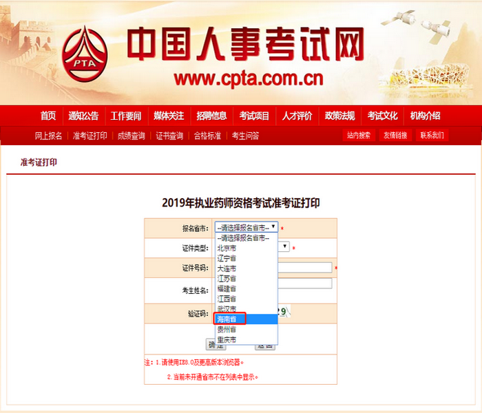 2019年執(zhí)業(yè)藥師考試馬上就要到了,中國人事考試網(wǎng)顯示海南省的準(zhǔn)考證打印入口已經(jīng)開通了,內(nèi)容如下: