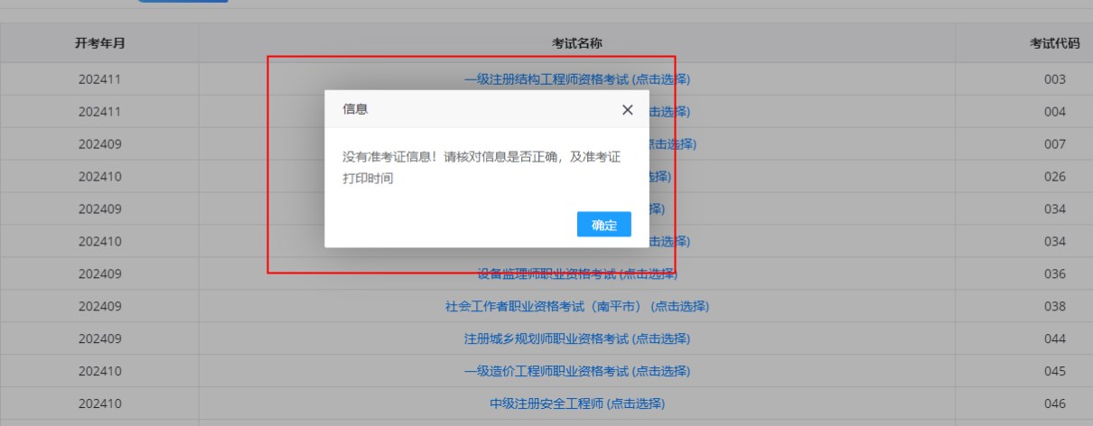 點(diǎn)擊“執(zhí)業(yè)藥師職業(yè)資格考試”即可進(jìn)行準(zhǔn)考證打印了!如果出現(xiàn)以下彈窗,說(shuō)明準(zhǔn)考證打印時(shí)間未到,在規(guī)定時(shí)間再去打印吧!