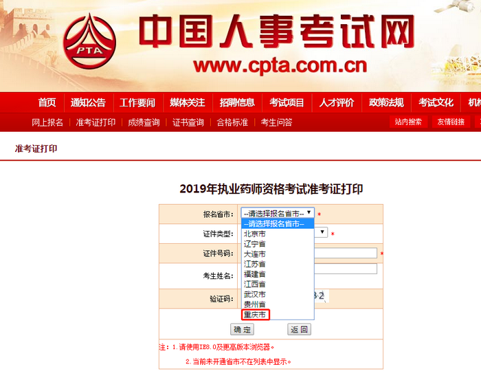 2019年執(zhí)業(yè)藥師考試即將開始,中國人事考試網(wǎng)顯示重慶市的準(zhǔn)考證打印入口已經(jīng)開通了,內(nèi)容如下: