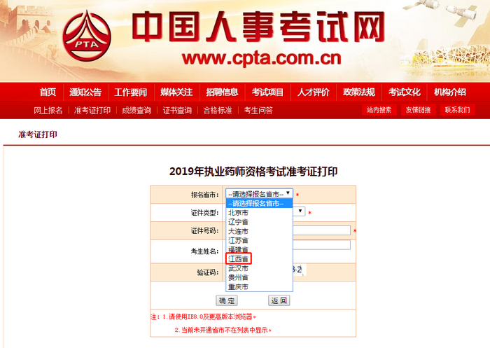 2019年執(zhí)業(yè)藥師考試即將開始,中國人事考試網(wǎng)顯示江西省的準考證打印入口已經(jīng)開通了,內容如下: