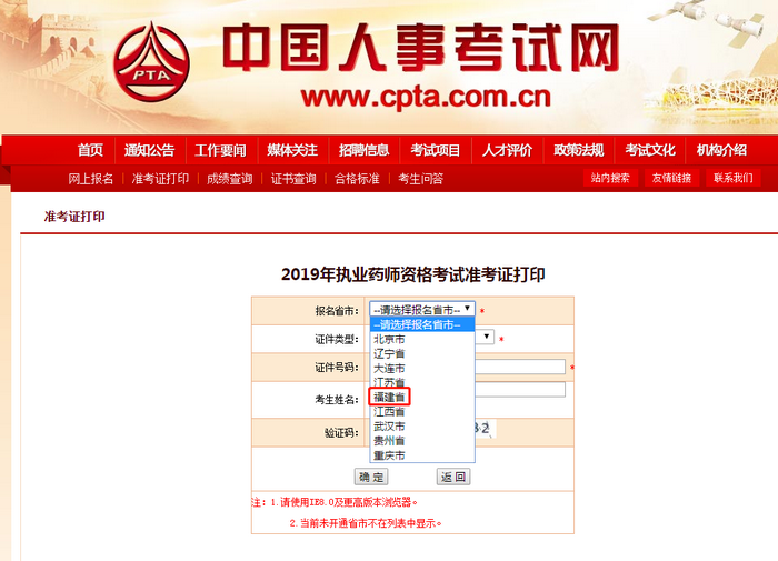 2019年執(zhí)業(yè)藥師考試即將開始,中國人事考試網(wǎng)顯示福建省的準(zhǔn)考證打印入口已經(jīng)開通了,內(nèi)容如下: