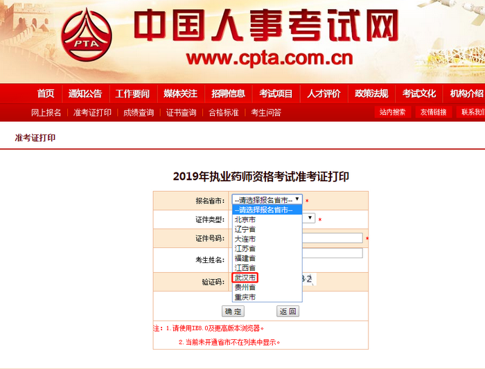 2019年執(zhí)業(yè)藥師考試即將開始,中國人事考試網(wǎng)顯示武漢市的準(zhǔn)考證打印入口已經(jīng)開通了,內(nèi)容如下: