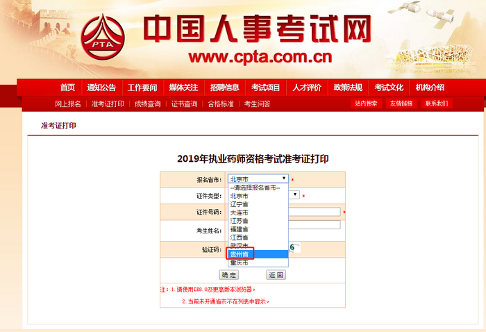 2019年執(zhí)業(yè)藥師考試即將開始,中國人事考試網(wǎng)顯示貴州省的準(zhǔn)考證打印入口已經(jīng)開通了,內(nèi)容如下: