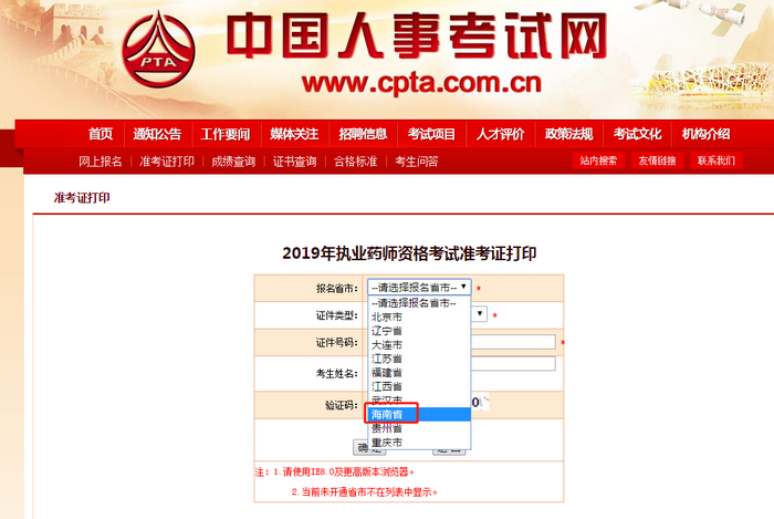 2019年執(zhí)業(yè)藥師考試即將開始,中國人事考試網(wǎng)顯示海南準(zhǔn)考證打印入口已經(jīng)開通了,內(nèi)容如下: