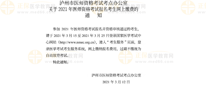 瀘州市2021年執(zhí)業(yè)醫(yī)師實(shí)踐技能繳費(fèi)時(shí)間:請(qǐng)于2021年3月15至2021年3月25日登錄國家醫(yī)學(xué)考試中心網(wǎng)站(http:/www.nmec.org.cn),進(jìn)人“考生服務(wù)”頁面,登錄醫(yī)學(xué)考試考生服務(wù)系統(tǒng),網(wǎng)上繳納報(bào)名費(fèi)用,過期不繳視為自動(dòng)放棄考試。
