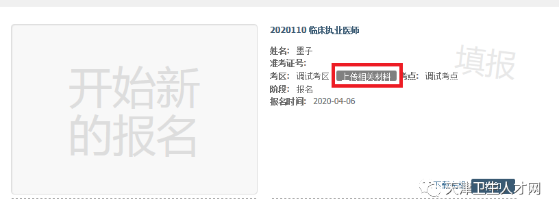 考生進(jìn)入考生報(bào)名系統(tǒng),查看自己的報(bào)名信息,在報(bào)名信息處,點(diǎn)擊「上傳相關(guān)材料」按鈕