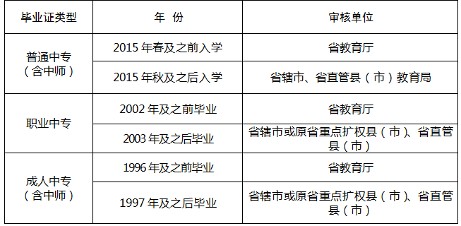 注:1.職業(yè)中專(zhuān)包含職業(yè)高中,成人中專(zhuān)含教師進(jìn)修學(xué)校發(fā)放的畢業(yè)證。2.職業(yè)中專(zhuān)和成人中專(zhuān)的審核權(quán),按照實(shí)際驗(yàn)印中的用印情況來(lái)區(qū)別,即“誰(shuí)蓋章,誰(shuí)審核”。