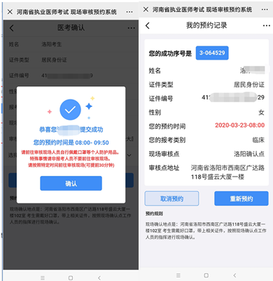 1.考生預(yù)約成功后,點(diǎn)擊預(yù)約成功頁的確認(rèn)按鈕(如上圖左),可看到預(yù)約記錄,如上圖右。