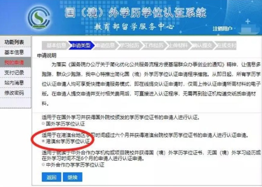 第三步:選擇申請(qǐng)類型,港澳臺(tái)學(xué)歷學(xué)位認(rèn)證