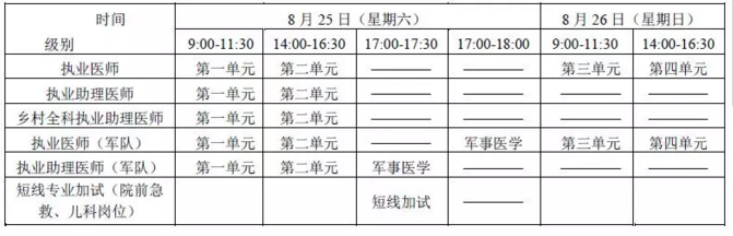 臨床、中醫(yī)類、鄉(xiāng)村全科執(zhí)業(yè)助理醫(yī)師及軍隊、短線專業(yè)加試?yán)^續(xù)采用筆試方式,口腔、公共衛(wèi)生類別采用計算機化考試,“一年兩試”很可能繼續(xù)采用機考,具體考試時間如下:
